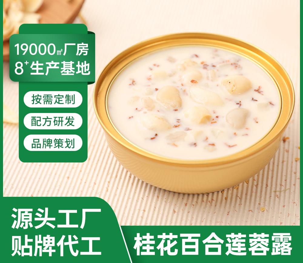 按需定制,配方研发,品牌策划,源头工厂,贴牌代工,桂花百合莲蓉露