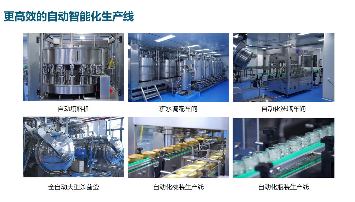 原料优选体系——糖水甜品预处理工艺——自动洗瓶(依靠超声波形成的气泡破裂,强力清洁瓶体)——糖水调配——人工投料——自动灌装——自动封口——分段式杀菌——风干——严格灯检——包装出货