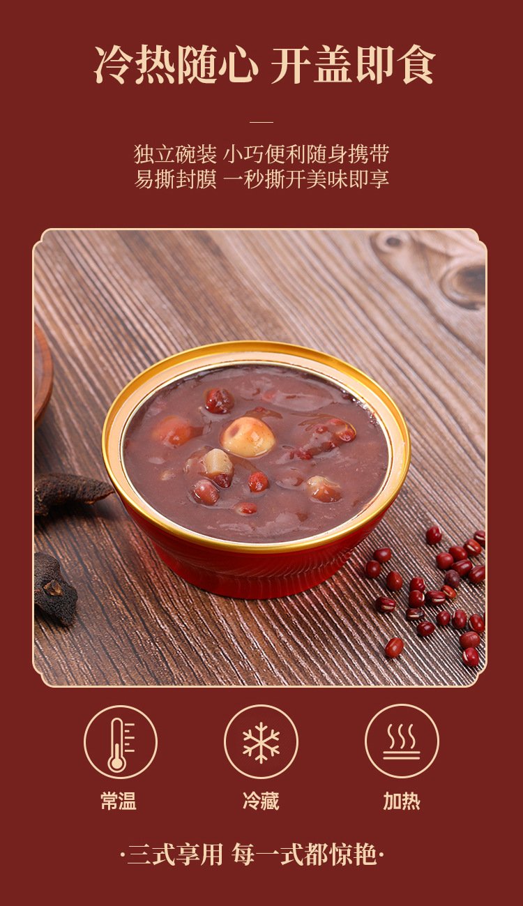 冷热随心,开盖即食。独立碗装,小巧便利随身携带。易撕封膜,一秒撕开美味即享。常温、冷藏、加热、三式享用,每一式都惊艳。