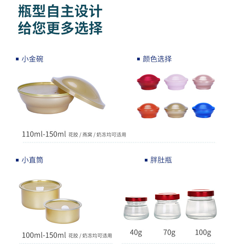 可选碗型、瓶型展示,小金碗,110ML-150ML花胶、奶冻均可用,多种颜色可选。