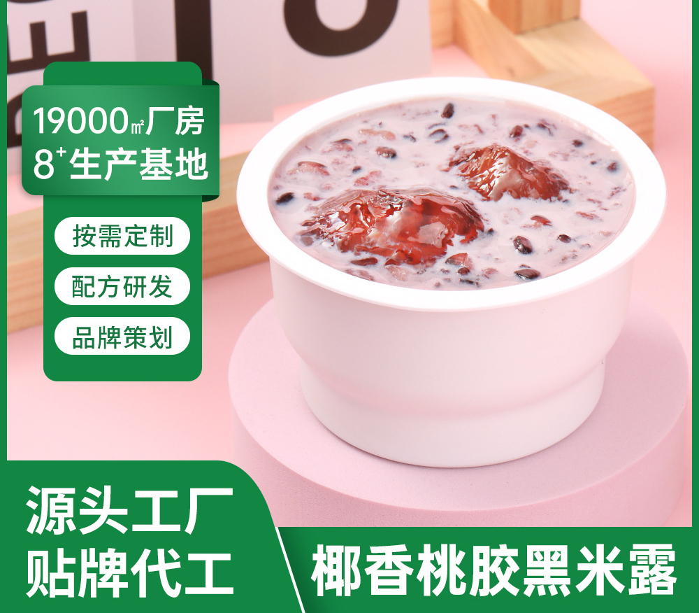 配方研发,按需定制,品牌策划,源头工厂,贴牌代工,椰香桃胶黑米露