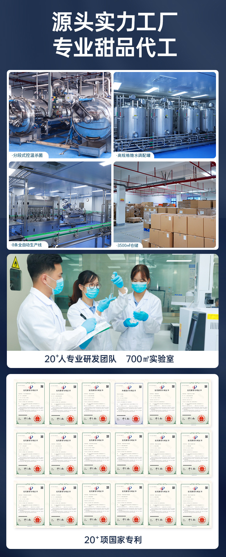 源头实力工厂,专业甜品代工,分段式控温杀菌,高规格糖水调配罐,多条全自动生产线,3500㎡仓储,20多人专业研发团队700㎡实验室,20多项国家专利
