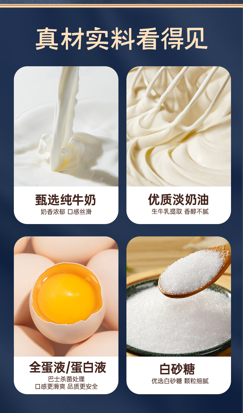 真材实料看得见,甄选纯牛奶,优质淡奶油,奶香浓郁口感丝滑,生牛乳提取香醇不腻,全蛋液/蛋白液,白砂糖,巴士杀菌处理,优选白砂糖颗粒细腻,口感更滑爽品质更安全