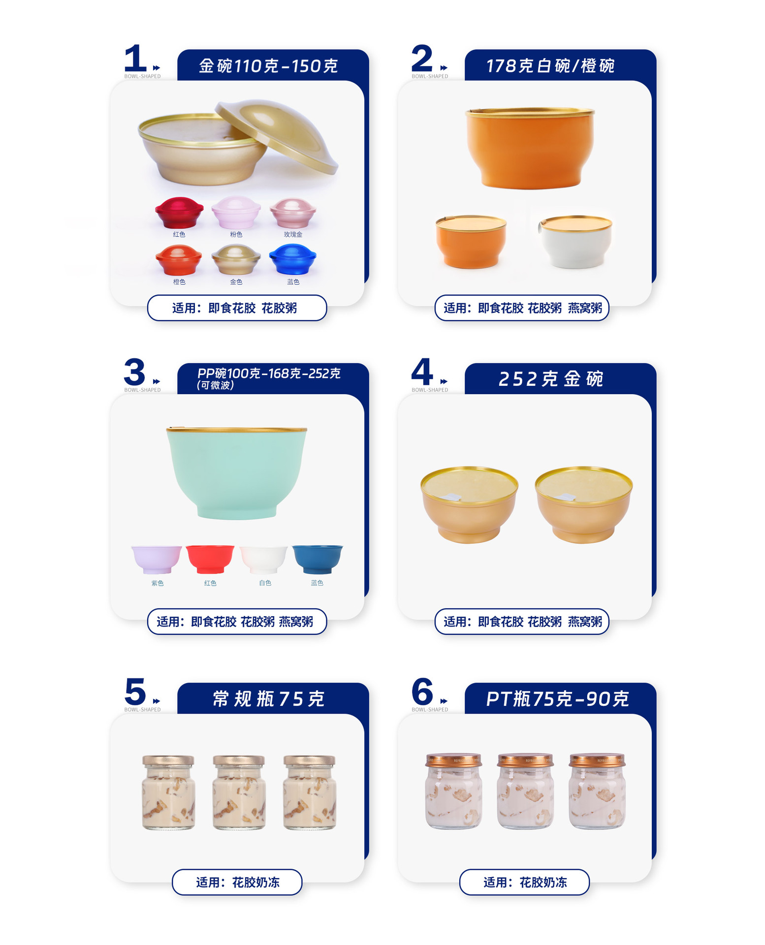 可选碗型、瓶型展示,小金碗,110ML-150ML花胶、奶冻均可用,多种颜色可选。